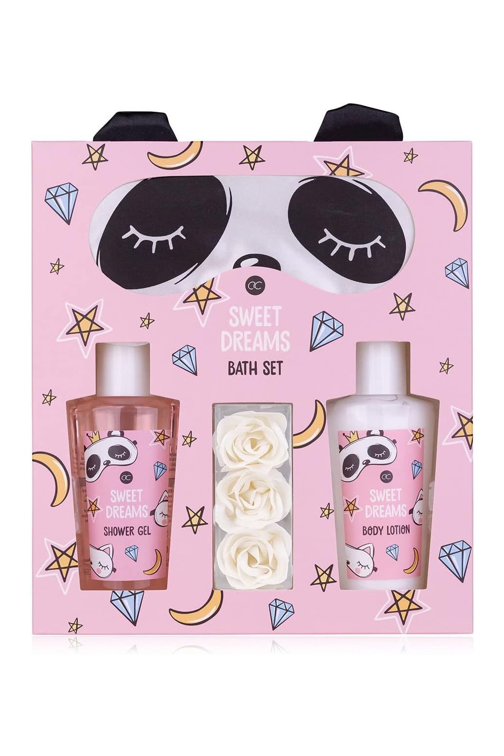 Sada obsahuje sprchový gél 120 ml, telové mlieko 120 ml, 3 konfety do kúpeľa v tvare ruže a luxusnú masku na spanie.