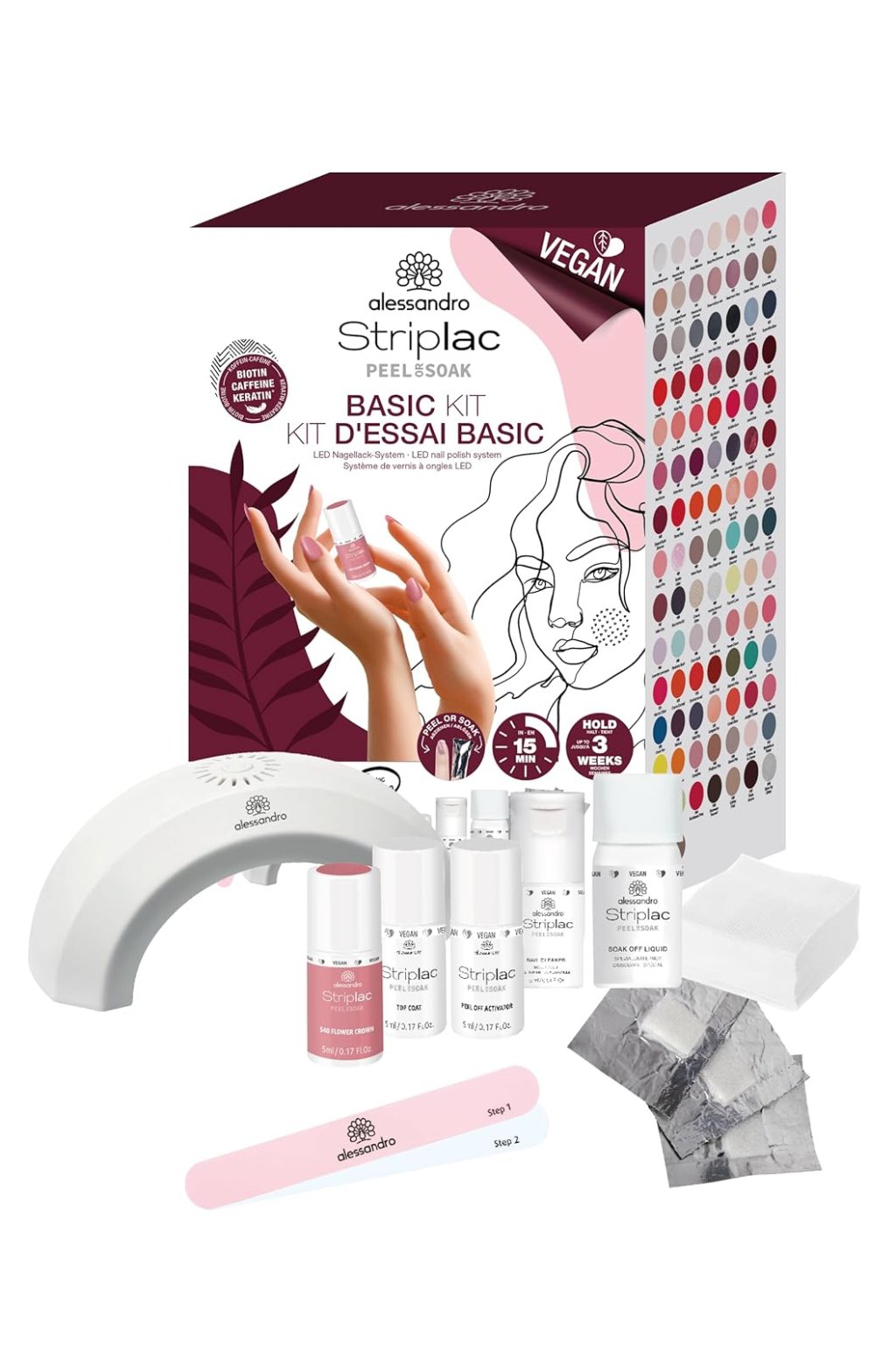 Základná štartovacia sada Striplac vrátane 1 x vrchného laku, 1 x UV laku na nechty v tvare kvetu 5 ml, 1 x dvojnásobného vysokorýchlostného leštiaceho pilníka, 10 x odstraňovacích fólií, 1 x odmasťovacej tekutiny 30 ml, 1 x aktivátora odlupovania 5 ml, 1 x LED lampy.
