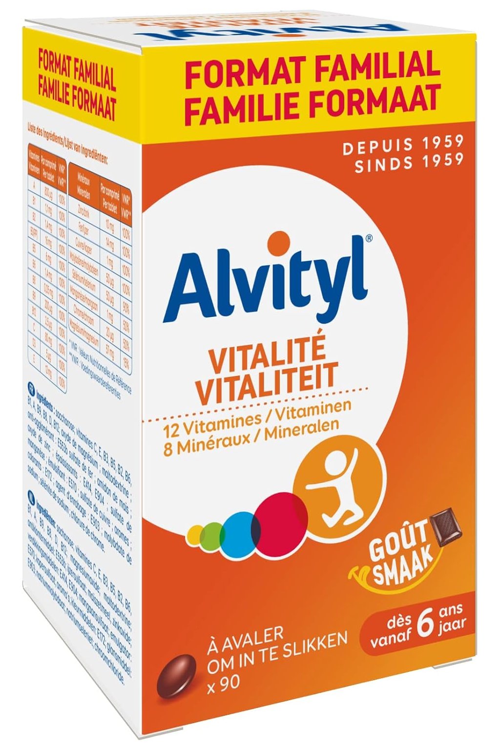 12 vitamínov a 8 minerálov špeciálne dávkovaných tak, aby pokryli 100 % VWR (nutričné referencie). Fyzická zdatnosť a vitalita vďaka vitamínom B3, B6, B9 a C, železu a horčíku, pomáhajú bojovať proti únave. Rast kostí vďaka vitamínu D. Ľahké prehĺtanie, čokoládová príchuť – malá tableta, ktorá sa ľahko prehĺta.