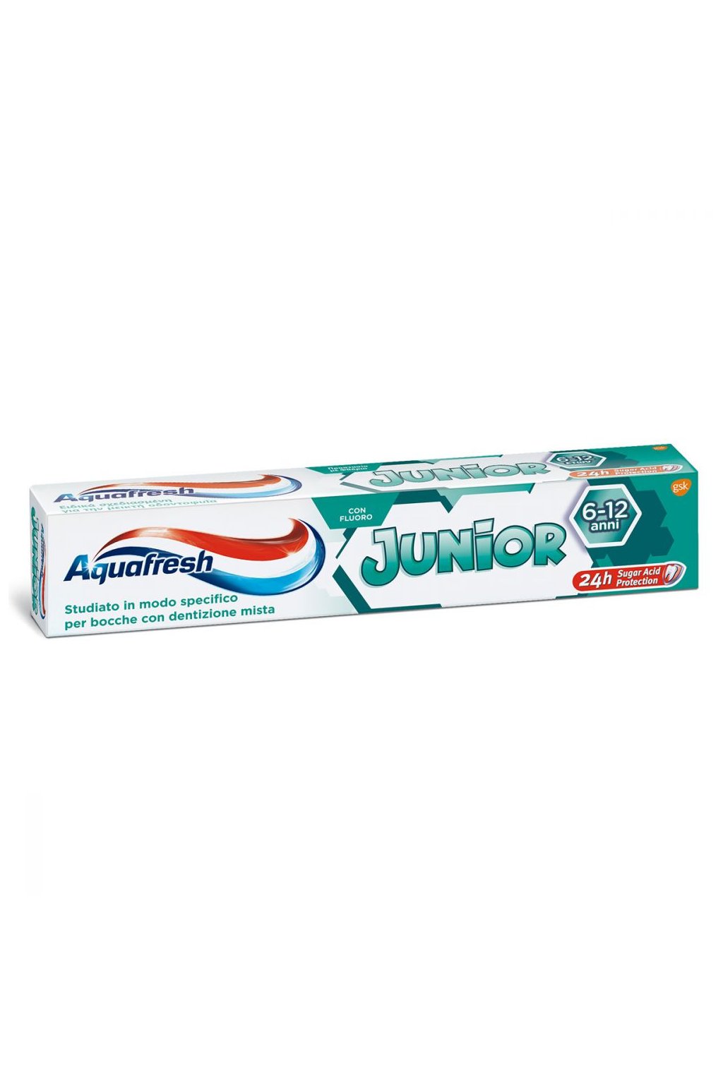 Aquafresh Junior je zubná pasta navrhnutá špeciálne pre deti vo veku od 6 rokov, ktoré prechádzajú obdobím zmiešanej dentície. Jej nízkoabrazívne zloženie jemne čistí zuby a zároveň poskytuje účinnú ochranu pred zubným kazom. Obsahuje fluorid sodný (1450 ppm), ktorý posilňuje zubnú sklovinu a pomáha chrániť nové trvalé zuby pred poškodením. Jemná mätová príchuť je prispôsobená detskému vkusu, čo podporuje pravidelné čistenie zubov.
