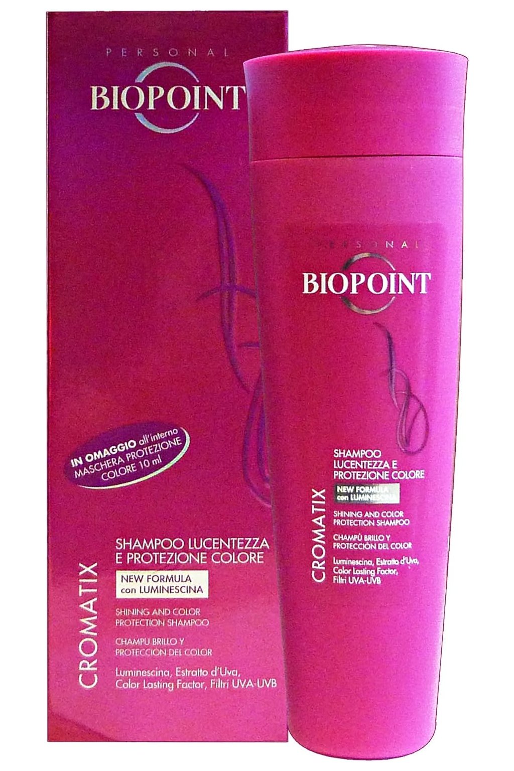 Biopoint Cromatix šampón na ochranu farby (200 ml) je určený na starostlivosť o farbené vlasy a pomáha predlžovať žiarivosť a intenzitu farby. Šampón jemne čistí vlasy, zároveň ich hydratuje a vyživuje, zanecháva ich jemné, hladké a ľahko rozčesateľné. Pomáha obnovovať pružnosť vlasovej štruktúry, dodáva lesk a chráni vlasy pred vyblednutím a vonkajšími vplyvmi. Tento produkt je vhodný pre pravidelné používanie a podporuje dlhodobú ochranu farby, pričom vlasy vyzerajú zdravé, žiarivé a plné vitality.