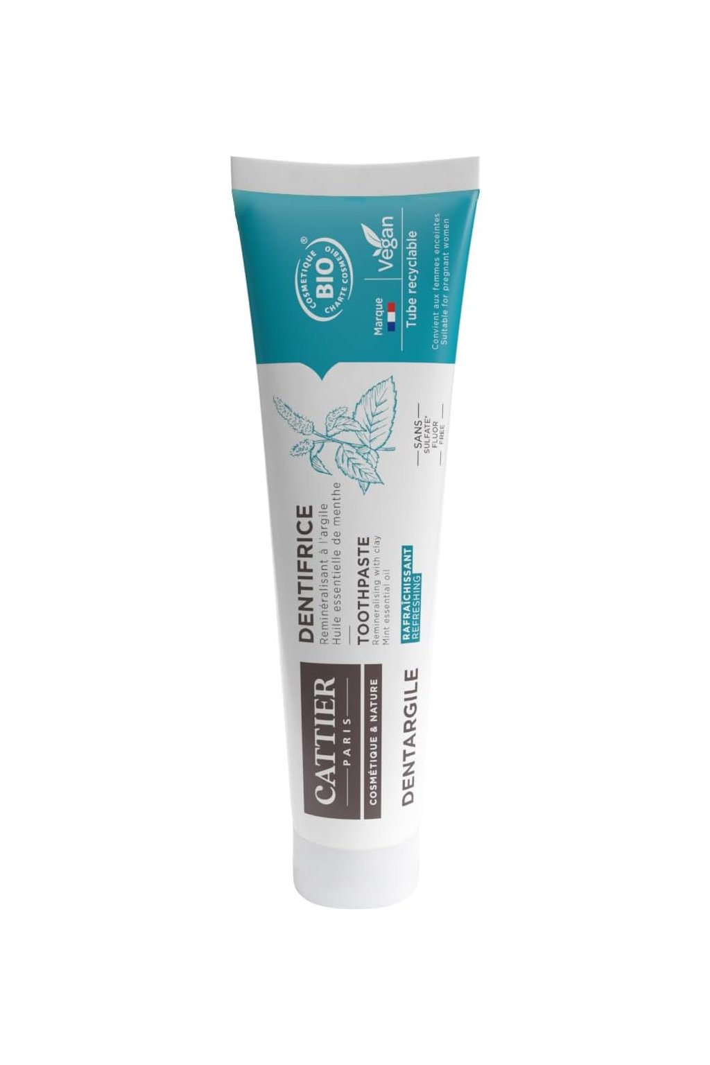 Cattier Dentargile Menthe osviežujúca zubná pasta – 75 ml prináša jedinečný spoj prírodnej starostlivosti vychádzajúcej z francúzskej odbornosti. Kombinácia jemného ílu s osviežujúcou mätou zanecháva ústnu dutinu príjemne čistú a sviežu, bez použitia agresívnych látok. Pena účinne čistí zuby, odstraňuje povlak a znižuje zápach, pričom rešpektuje citlivé ďasná. Formula bez fluoridov, parabénov a umelých farbív je vhodná aj pre vegánov a alergikov. Príjemná textúra a harmonická chuť mäty z nej robí ideálneho spoločníka pre každodennú rannú aj večernú hygienu.