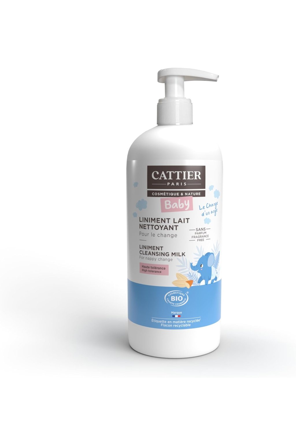 Cattier detské čistiace mlieko (500 ml) – jemné čistiace mlieko bez oplachovania, s organickým mandľovým olejom a výťažkom z nechtíka na upokojenie a hydratáciu citlivej pokožky bábätiek.