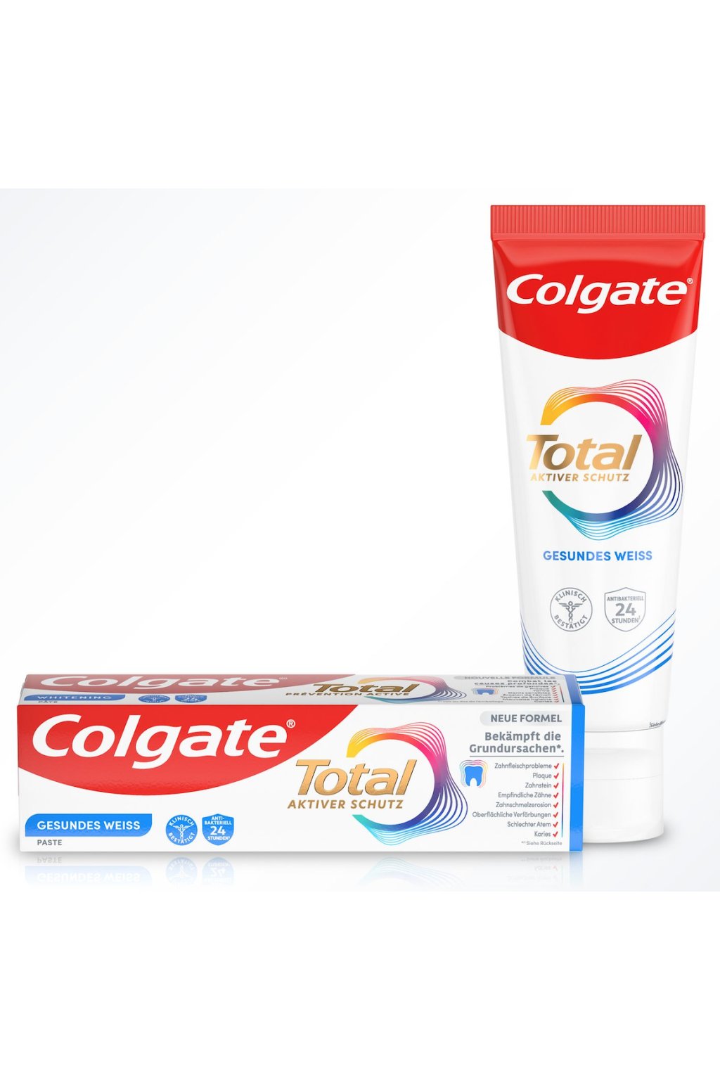 Colgate Total Whitening je pokročilá zubná pasta s unikátnou technológiou Dual‑Zink, ktorá poskytuje až 24‑hodinovú antibakteriálnu ochranu pre zuby, jazyk, ďasná aj líca.