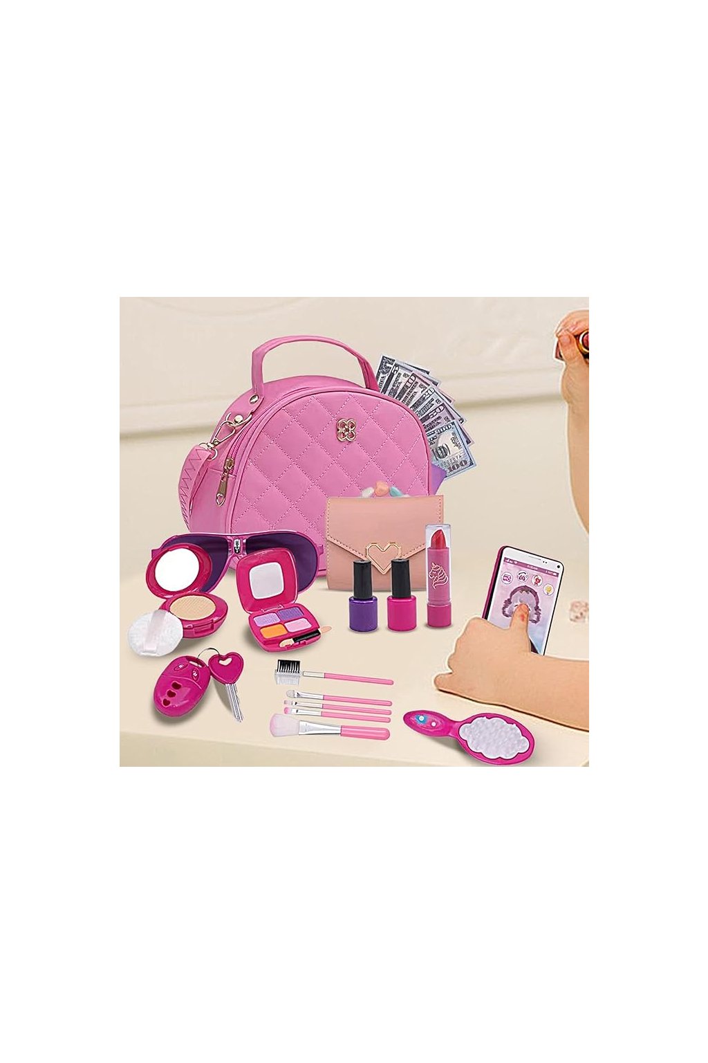 telefón, slnečné okuliare, kľúče a kreditné karty, a ponúka nekonečné možnosti hrania rolí pre dievčatá