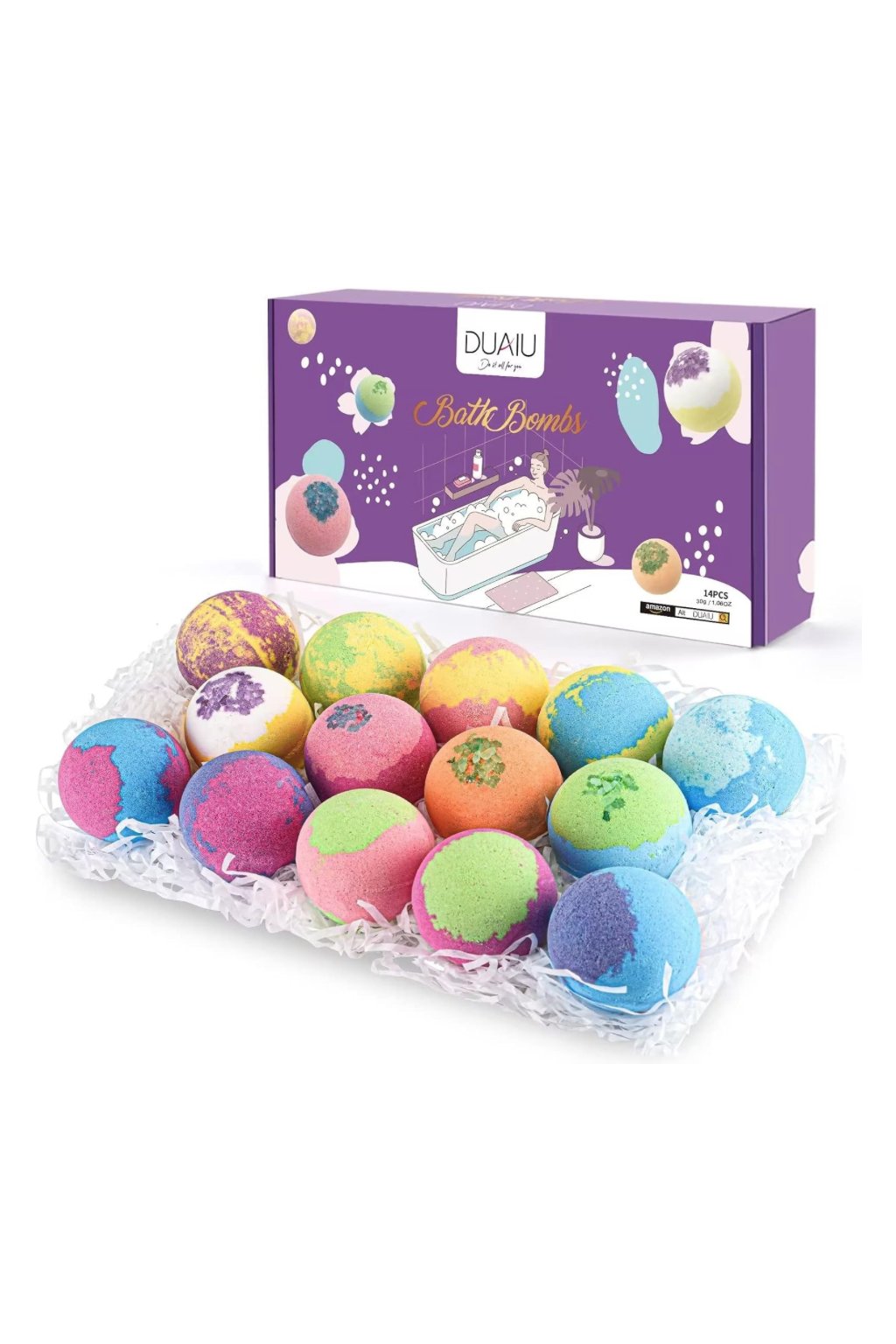 Doprajte si luxusný zážitok z kúpeľa s darčekovou sadou DUAIU. Obsahuje 14 šumivých guličiek do kúpeľa, ktoré uvoľňujú prírodné esenciálne oleje a jemné vône, ako sú levanduľa, mäta, kokos a ďalšie.