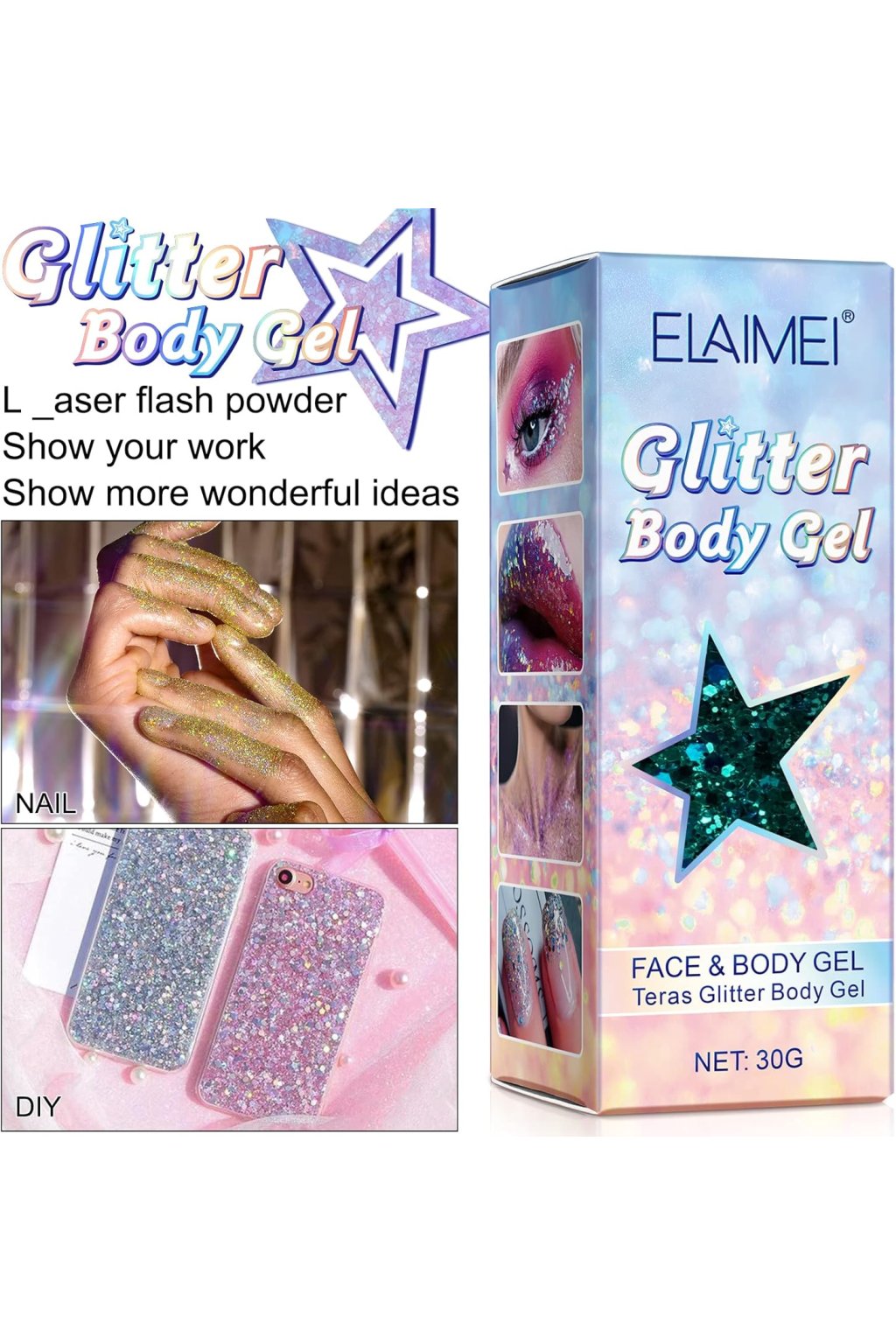Telový trblietavý gél, Je bezpečné používať na pokožku a hustá trblietková sada je dodávaná s malými hviezdami, malými mesiacmi a šesťuholníkmi. Lesk a farba laserových trblietok sa líši v závislosti od uhla a svetla, čo je ideálne na darčeky a na sebazdobenie.