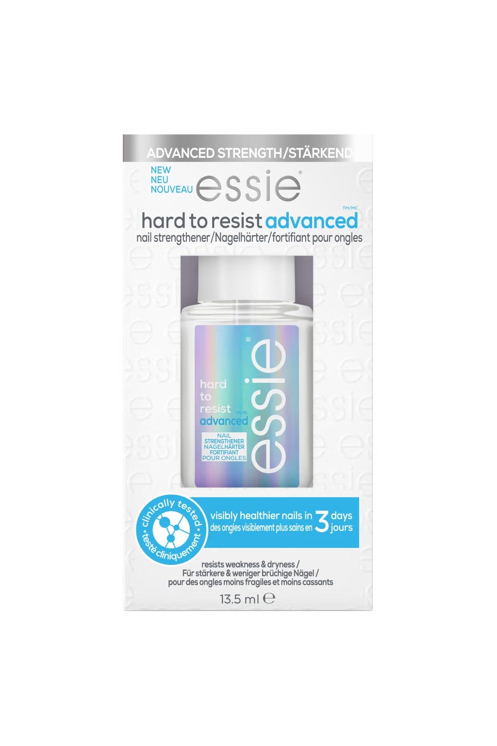 Essie Hard To Resist Advanced je posilňujúci lak, ktorý chráni nechty pred každodenným opotrebovaním. Vďaka klinicky vylepšenému transparentnému zloženiu pravidelným používaním posilňuje a spevňuje nechty. Exkluzívny štetec Easy Glide zabezpečuje rýchlu a rovnomernú aplikáciu pre bezchybnú manikúru.