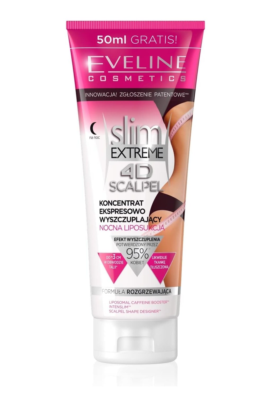 Eveline Cosmetics Slim Extreme 4D Scalpel Koncentrát Rýchleho Zoštíhľovania na Noc 250 ml je intenzívne účinný nočný telový koncentrát vyvinutý na podporu zoštíhľovania a redukcie podkožného tuku počas spánku. Vďaka pokročilému 4D komplexu, ktorý kombinuje aktívne látky s lipolytickými a drénujúcimi vlastnosťami, podporuje tento produkt mikrocirkuláciu, aktivuje metabolizmus tukových buniek a napomáha zlepšiť vzhľad siluety. Pravidelné používanie pôsobí proti efektu „pomarančovej kože“, pomáha spevniť pokožku, zlepšuje jej pružnosť a viditeľne redukuje objem kritických partií ako stehná, boky či brucho. Jemná, rýchlo sa vstrebávajúca textúra sa ľahko nanáša a pracuje počas noci, keď je telo v regeneračnej fáze, čo maximalizuje účinok. Tento koncentrát je ideálny pre tých, ktorí hľadajú podporu pri formovaní postavy v kombinácii so zdravým životným štýlom.