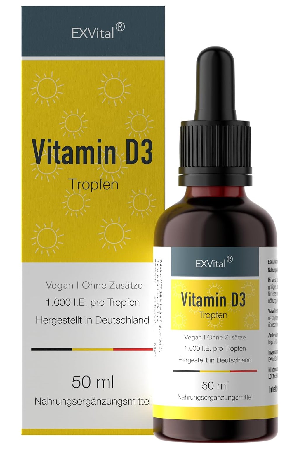 Exvital vitamín D3 1000 IU na kvapku 50 ml je doplnok stravy určený na podporu správnej funkcie kostí, svalov a imunitného systému. Kvapková forma umožňuje jednoduché dávkovanie a presné prispôsobenie potrebám organizmu. Vitamín D3 podporuje vstrebávanie vápnika a fosforu, čo prispieva k pevnosti kostí a zubov, zároveň podporuje normálnu činnosť svalov a imunitného systému. Produkt je vhodný pre dospelých aj deti, neobsahuje umelé farbivá ani konzervanty a je jednoduchý na použitie každý deň.