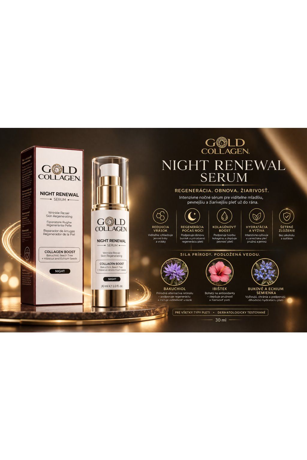 Nočné sérum Gold Collagen Night Renewal je intenzívna regeneračná starostlivosť navrhnutá na obnovu pleti počas spánku. Pomáha redukovať vrásky, podporuje regeneráciu pokožky a zlepšuje jej pevnosť a elasticitu.