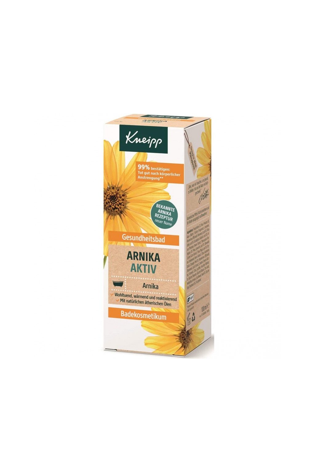 Upokojujúci, hrejivý a reaktivačný kúpeľ Kneipp® Health Bath Arnica Active obsahuje cenný extrakt z arniky a prírodné éterické oleje z druhov cabreuva, rozmarín a borovica.
