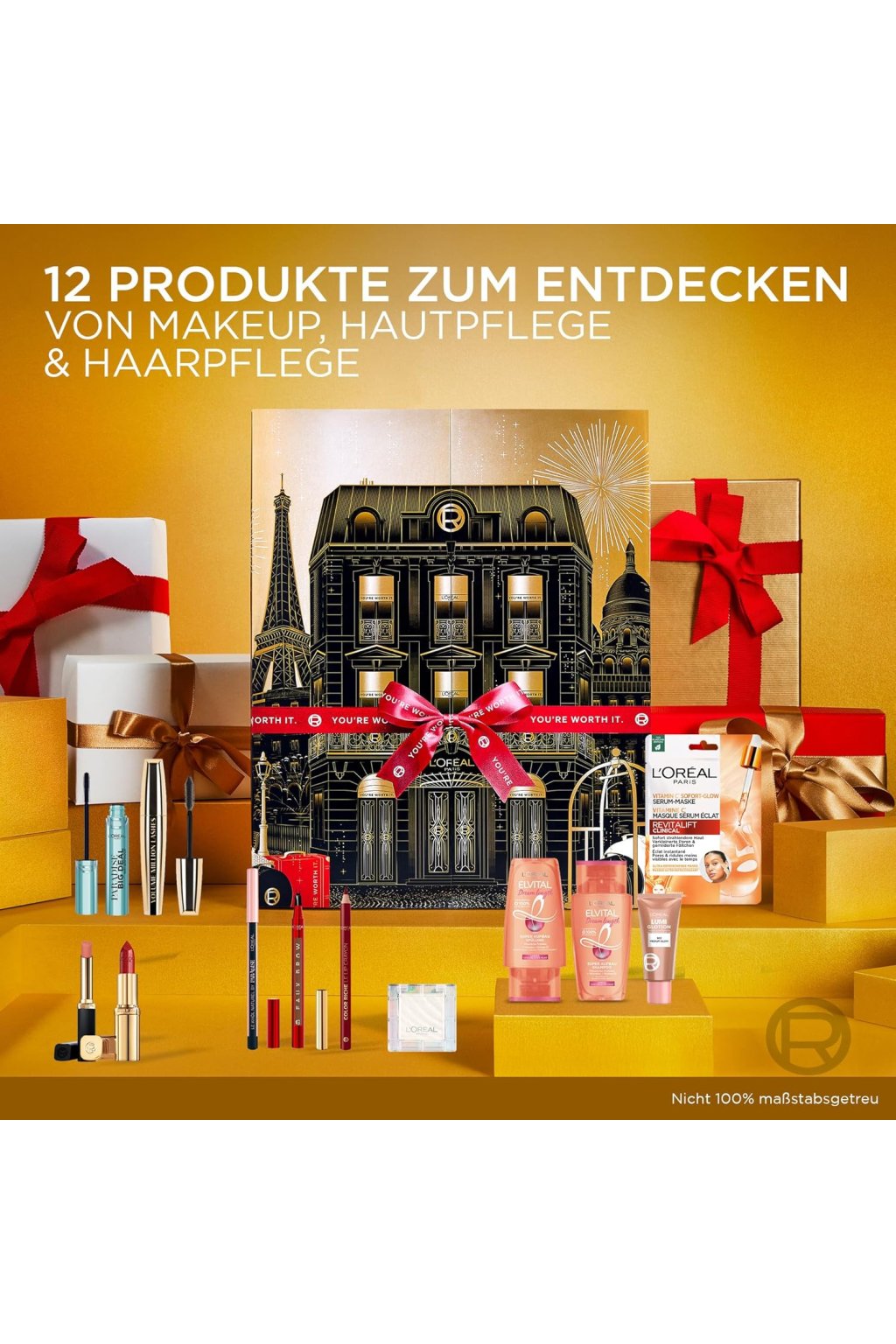 Obsah balenia: 1 x mini adventný kalendár L'Oréal Paris, 12 kozmetických prekvapení, 9 produktov na líčenie, 1 produkt na starostlivosť o tvár a 2 produkty na starostlivosť o vlasy.