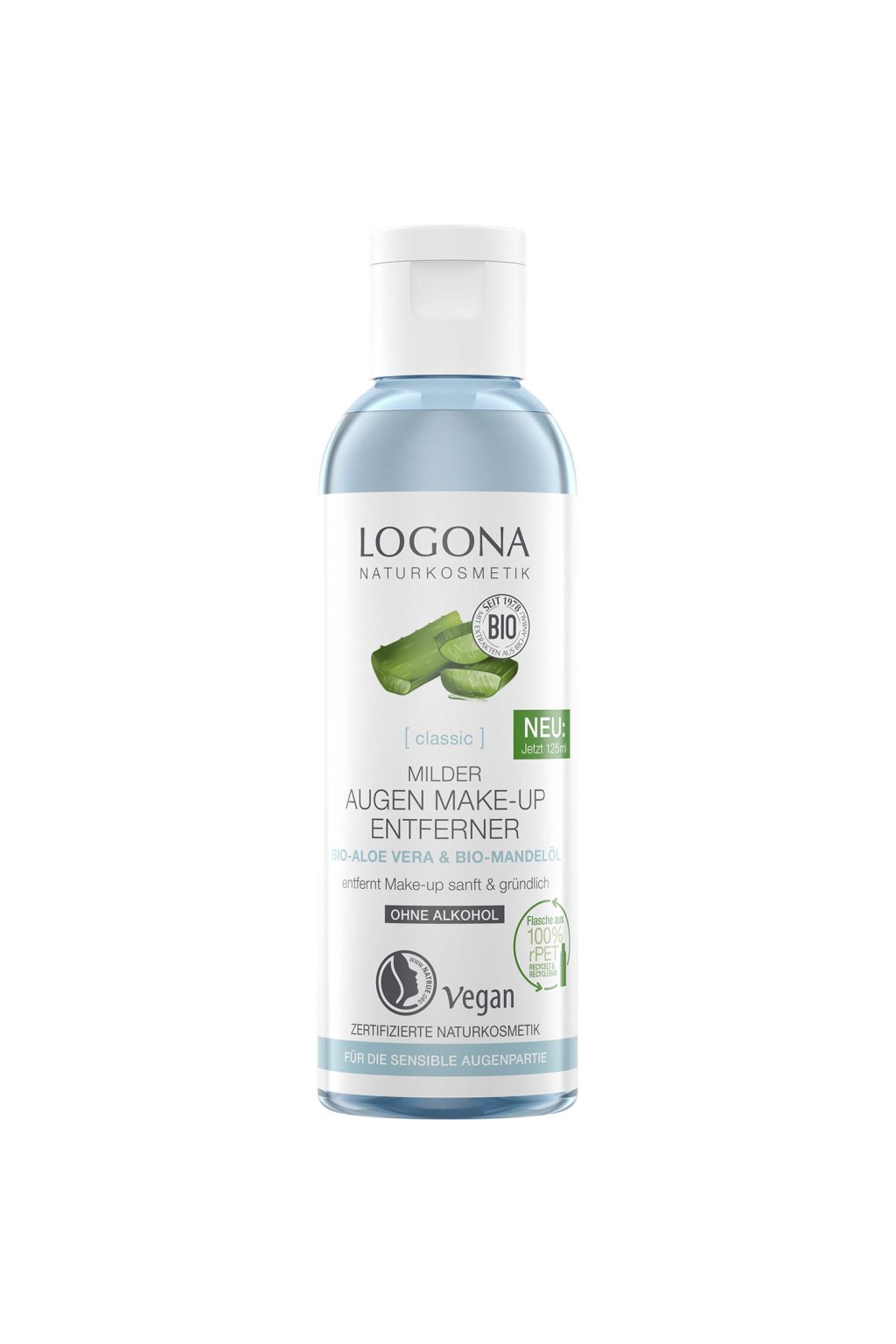 LOGONA Prírodný odličovač očí s bio aloe vera a mandľovým olejom 125 ml je jemný, no účinný prípravok určený na šetrné odstránenie očného make-upu bez podráždenia citlivej pokožky v okolí očí.