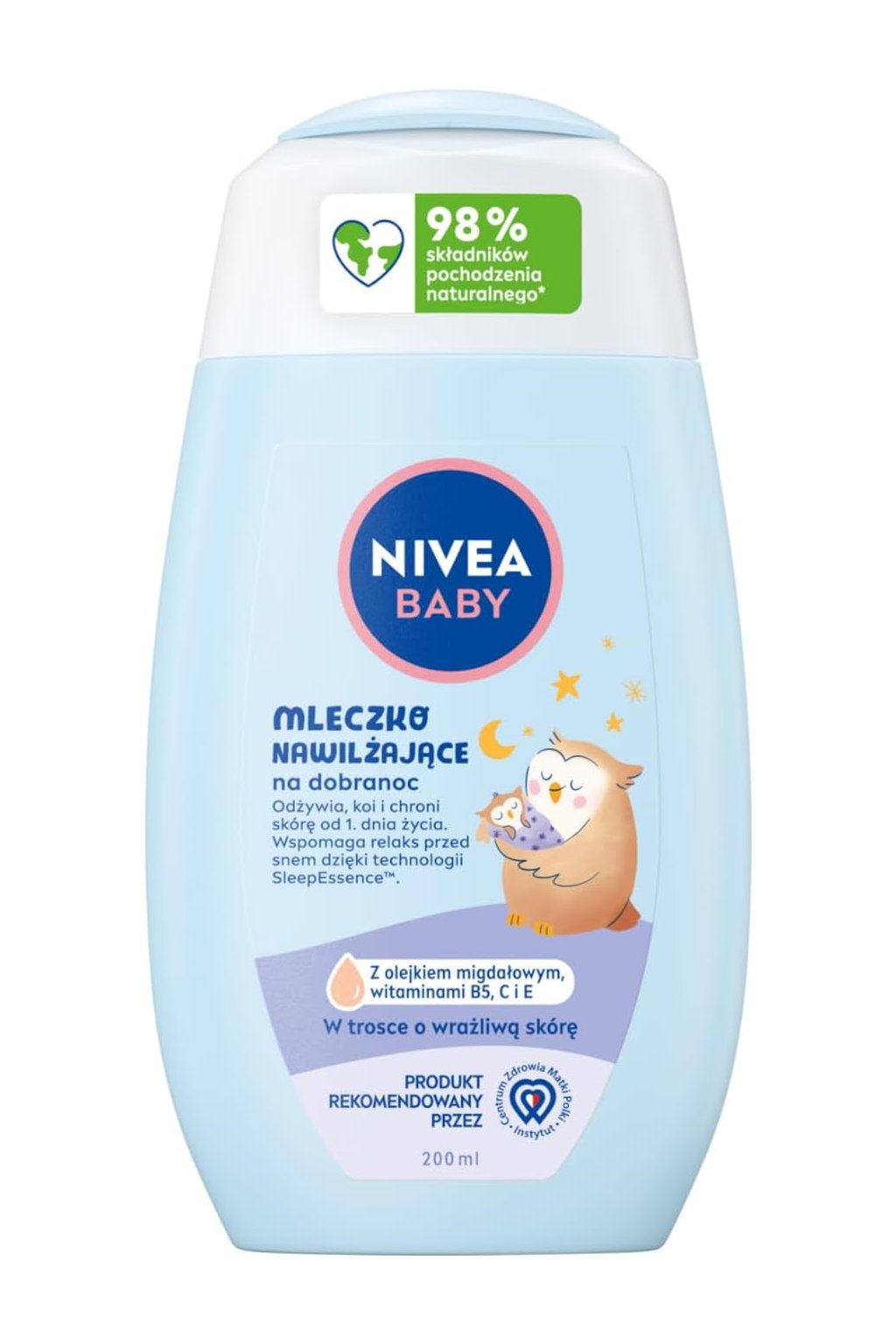 NIVEA Baby Hydratačné telové mlieko na dobrú noc 200 ml je jemné telové mlieko určené pre každodennú starostlivosť o citlivú detskú pokožku pred spaním. Obsahuje prírodný mandľový olej a vitamíny B5, C a E, ktoré podporujú hydratáciu, upokojujú podráždenie a chránia kožnú bariéru. Vďaka technológii SleepEssence™ s jemnou vôňou levandule navodzuje pocit pokoja a pomáha deťom lepšie zaspať. Mlieko sa ľahko rozotiera, rýchlo sa vstrebáva a nezanecháva mastný film. Vhodné aj pre novorodencov.