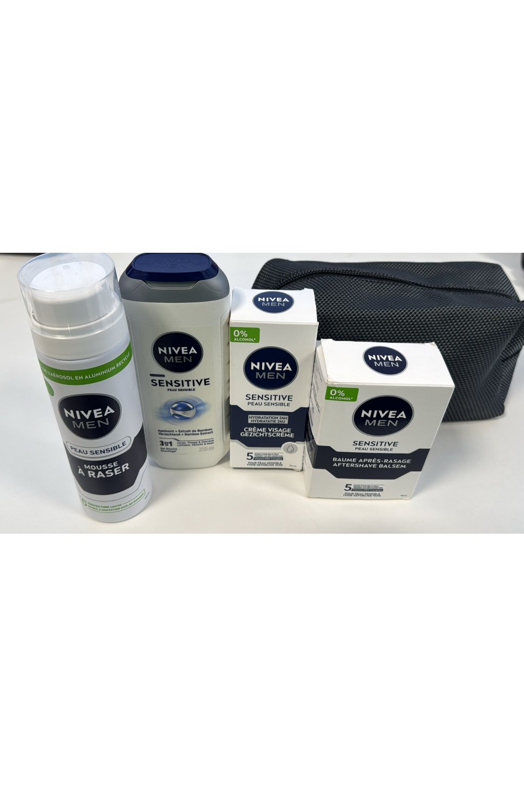 Darčeková sada starostlivosti pre mužov s citlivou pokožkou. V elegantnej čiernej taštičke nájdete výber produktov z radu NIVEA MEN Sensitive: pena na holenie, sprchový gél alebo 3‑v‑1 sprchová starostlivosť, balzám po holení (0 % alkoholu), všetko s jemnou a upokojujúcou formulou.
