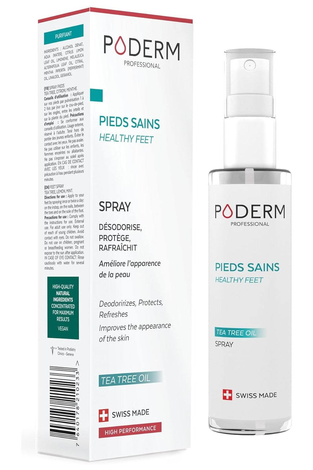 PODERM sprej proti zápachu a poteniu nôh (50 ml) je ideálny na boj proti nadmernému poteniu a nepríjemnému zápachu nôh. Obsahuje prírodné zložky ako tea tree olej, ktorý pôsobí proti baktériám a má dezinfekčné účinky, mätu na reguláciu potenia a citrón pre prirodzenú deodorizačnú funkciu. Tento sprej poskytuje dlhotrvajúcu ochranu, udržiava nohy svieže a suché počas celého dňa. Je vhodný pre každodenné používanie, najmä pred športovými aktivitami.