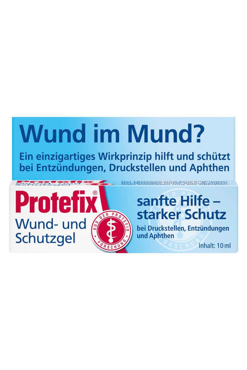 Protefix Wund- und Schutzgel je špecializovaný gél určený na podporu hojenia a ochranu podráždenej alebo poškodenej ústnej sliznice. Ideálny je pri aftách, zapálených miestach, otlakoch od protéz, strojčekov alebo po stomatologických zákrokoch. Vďaka aktívnej zložke TGO (glycerol-oxytriester) vytvára na poranenom mieste ochranný film, ktorý znižuje bolesť, urýchľuje regeneráciu a chráni pred ďalším podráždením. Neobsahuje alkohol, má neutrálnu chuť a je vhodný aj pre citlivé ústa. Aplikuje sa niekoľkokrát denne priamo na postihnuté miesto v malom množstve.