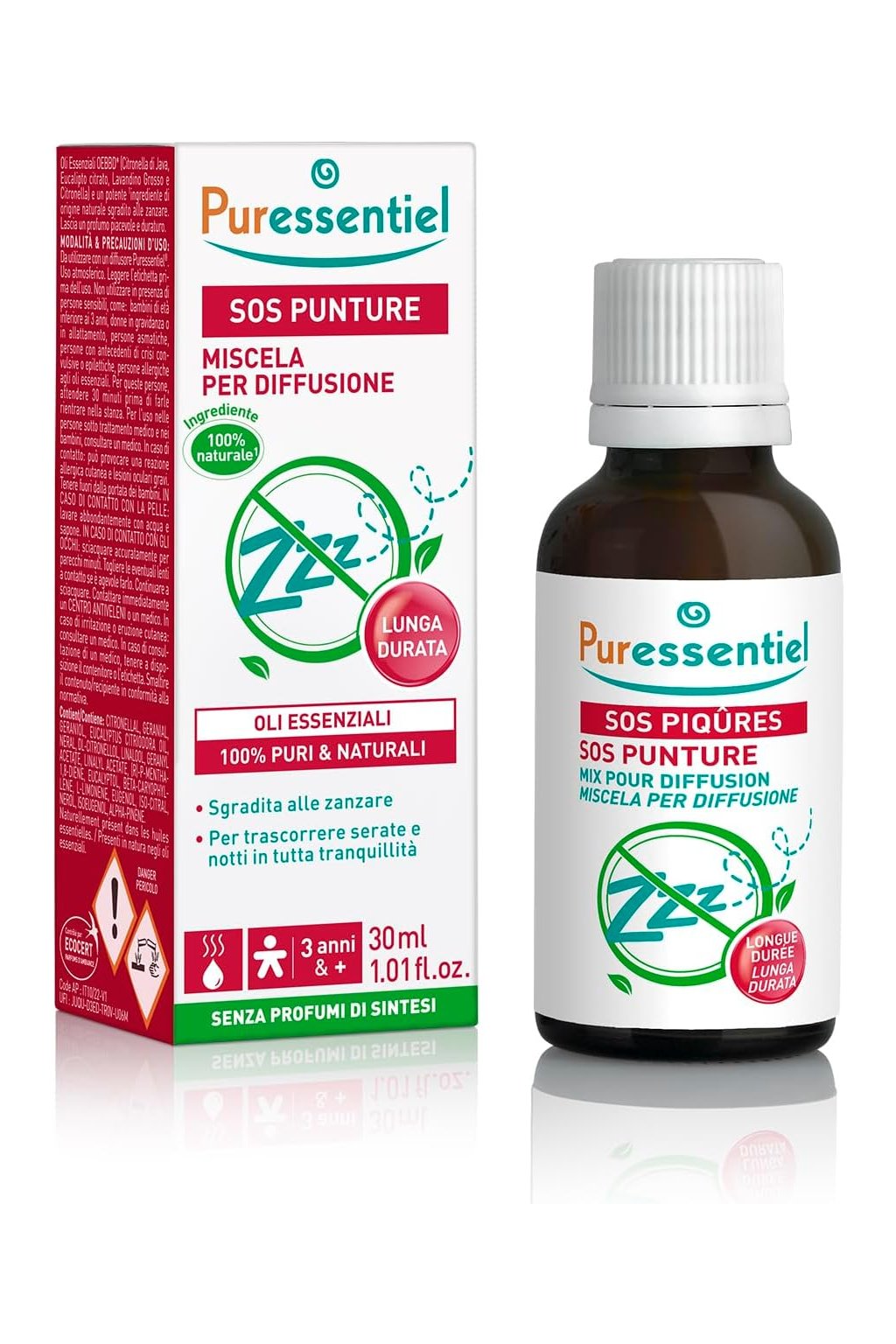 Puressentiel - SOS Puncture - esenciálne oleje na difúziu je starostlivo vytvorená zmes 100 % prírodných esenciálnych olejov, ktorá účinne pomáha odpudzovať komáre a iný hmyz. Pri difúzii vytvára príjemnú vôňu a zároveň pôsobí ako prírodná ochrana pri vonkajších aktivitách aj v interiéri. Oleje podporujú pohodovú atmosféru a poskytujú pocit sviežosti, pričom chránia vaše prostredie pred nepríjemným hmyzom. SOS Puncture je ideálny pre letné večery, kempovanie alebo domáce použitie, aby ste si mohli užívať čas bez dotieravých komárov.