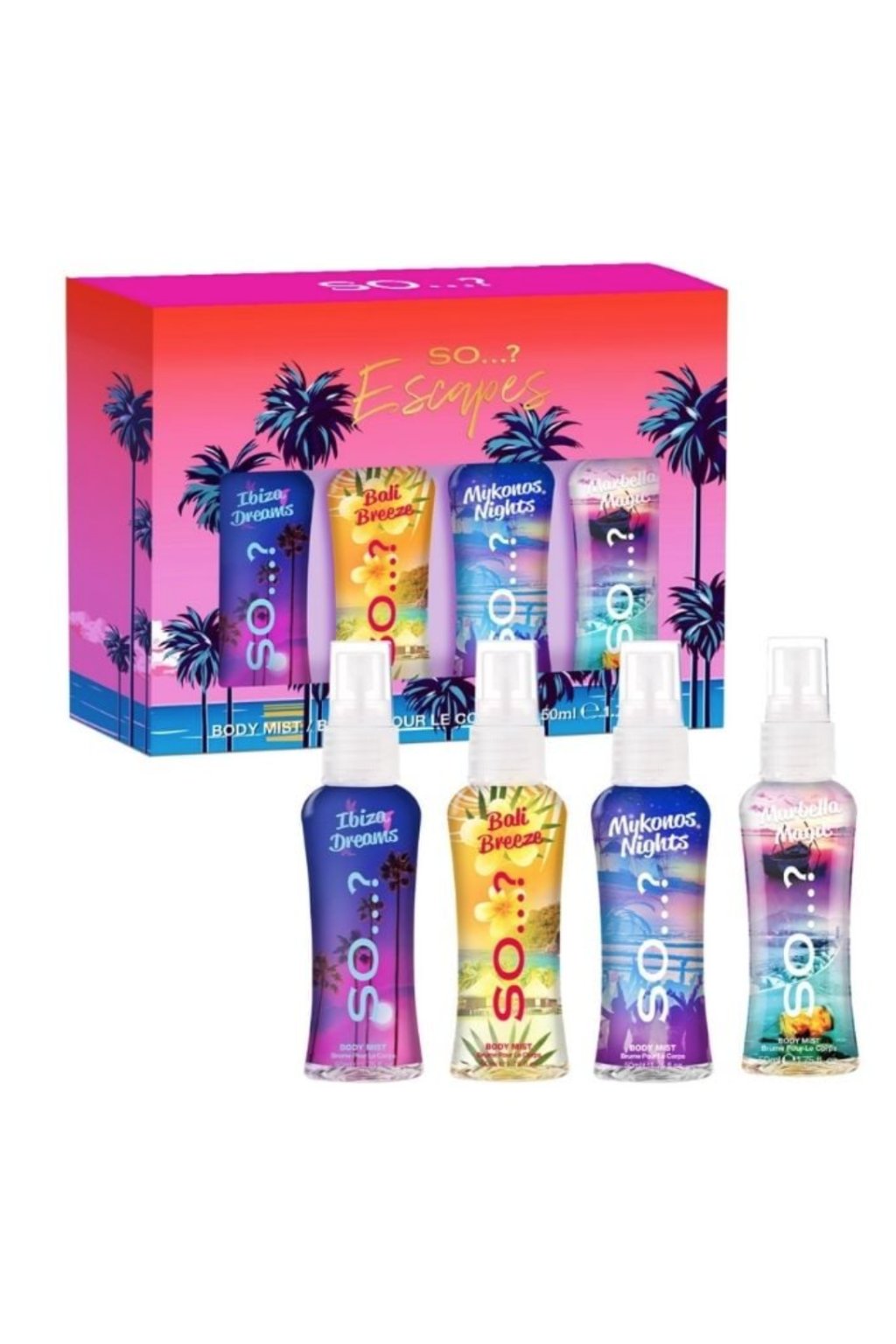 So...? Escapes Body Mist Set je ideálny spôsob, ako sa ponoriť do sviežich a exotických vôní, ktoré vás prenesú na tropické pláže. Tento set obsahuje štyri rôzne osviežujúce spreje, každý s jedinečnou vôňou, ktorá vyvoláva pocity dovolenky a odpočinku. S vôňami ako "Tropical Dreams", "Bali Breeze", "Mimosa Nights" a "Sundown Bliss" si môžete užiť celodennú sviežosť a energiu. Každý sprej má praktické balenie 50 ml, ideálne na každodenné osvieženie pokožky. Tento set je skvelým darčekom pre tých, ktorí hľadajú zábavnú, sviežu a rôznorodú voňavú skúsenosť.