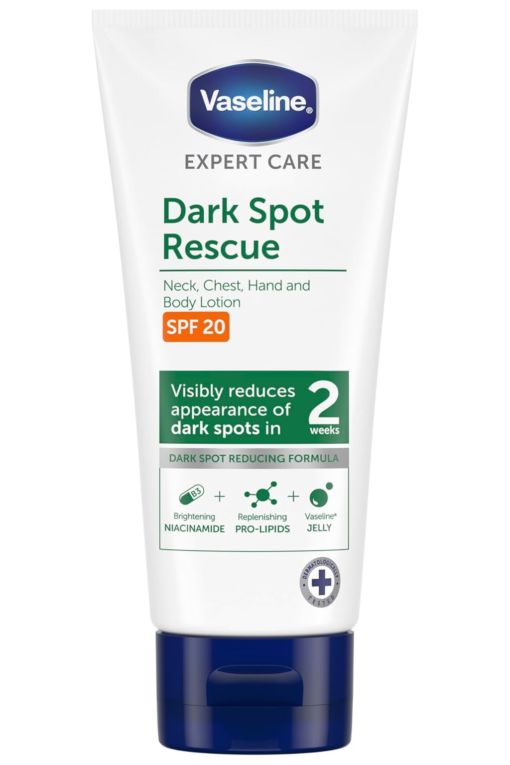 Vaseline Expert Care Dark Spot Rescue Telové mlieko na ruky a telo 100 ml je špeciálne vyvinuté pre starostlivosť o pokožku so sklonom k tmavým škvrnám a nerovnomernému tónu. Ľahká a rýchlo vstrebateľná formula intenzívne hydratuje, zjemňuje a pomáha redukovať viditeľnosť pigmentových nedokonalostí. Vďaka obsahu dermatologicky overených zložiek podporuje regeneráciu pokožky, zlepšuje jej pružnosť a navracia jej prirodzene zdravý vzhľad. Je vhodné na každodenné použitie na ruky aj celé telo a nezanecháva mastný film. Pri pravidelnom používaní zanecháva pokožku hebkú, žiarivú a rovnomerne tónovanú.