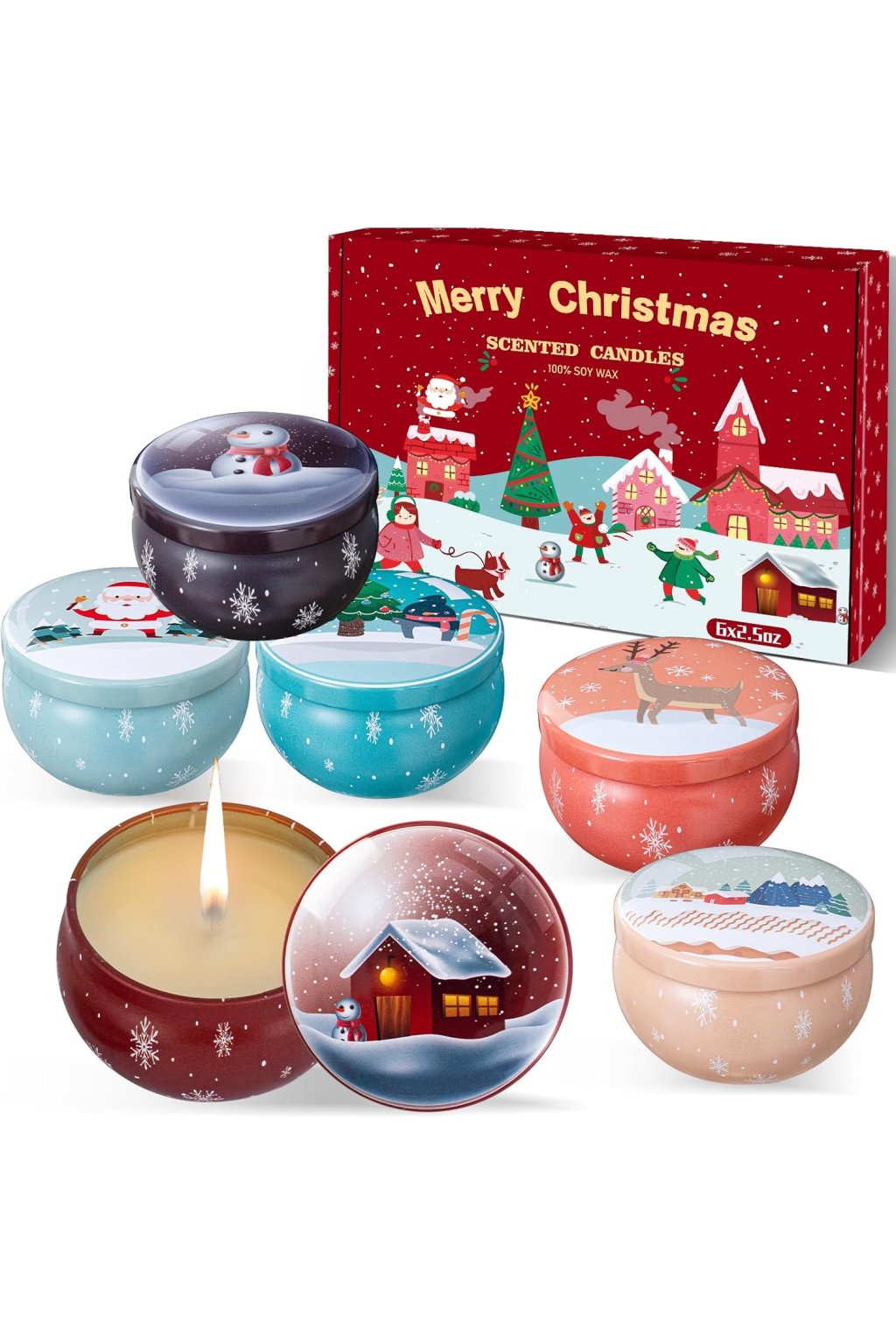 Merry Christmas Scented Candles – 6 ks prinášajú do vášho domova pravú sviatočnú atmosféru. Každá sviečka je v originálnej plechovej dóze s veselou zimnou ilustráciou, ktorá zaujme nielen deti, ale aj dospelých. Jemná vôňa sa uvoľňuje počas horenia a naplní miestnosť príjemnou arómou typickou pre Vianoce – škorica, vanilka a jemné ovocné tóny. Sviečky sú vyrobené z 100 % sójového vosku, ktorý horí rovnomerne a bez dymu, čím sa vytvára bezpečné a relaxačné prostredie. Tento set je ideálny ako darček alebo dekorácia na sviatočný stôl.
