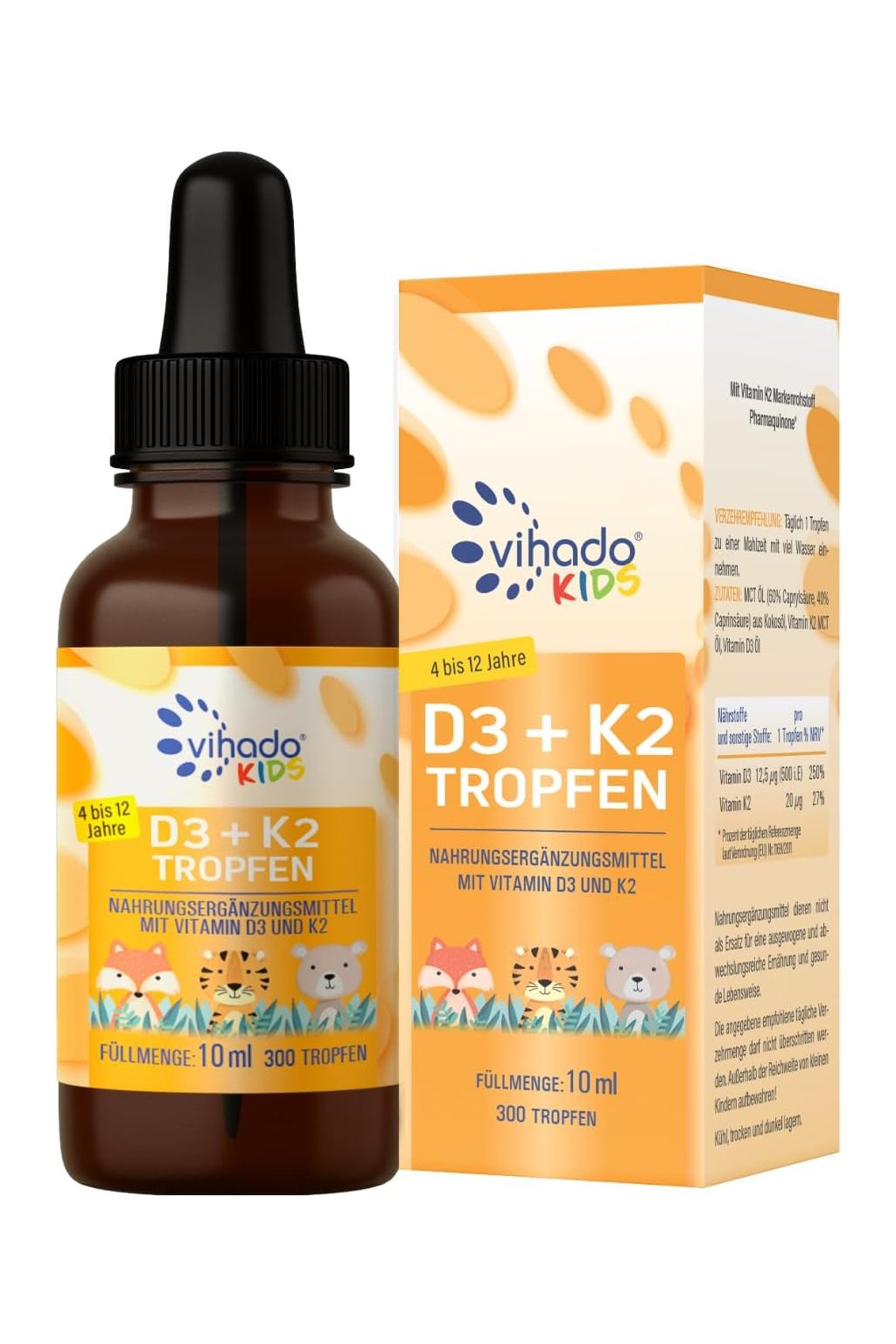 Vihado Vitamín D3 + K2 pre deti 10 ml kvapky sú špeciálne vyvinutý doplnok stravy určený na podporu rastu a zdravého vývoja detí. Kvapky kombinujú vitamín D3, ktorý prispieva k správnemu vstrebávaniu vápnika a fosforu a podpore kostí a zubov, s vitamínom K2 (MK-7), ktorý podporuje ich správne ukládanie a zdravú funkciu srdca. Produkt je vhodný aj pre citlivé deti, neobsahuje lepok ani laktózu a má jemnú, príjemnú chuť. Kvapky sa jednoducho dávkujú a podporujú zdravý vývoj kostí, zubov a imunitného systému detí.