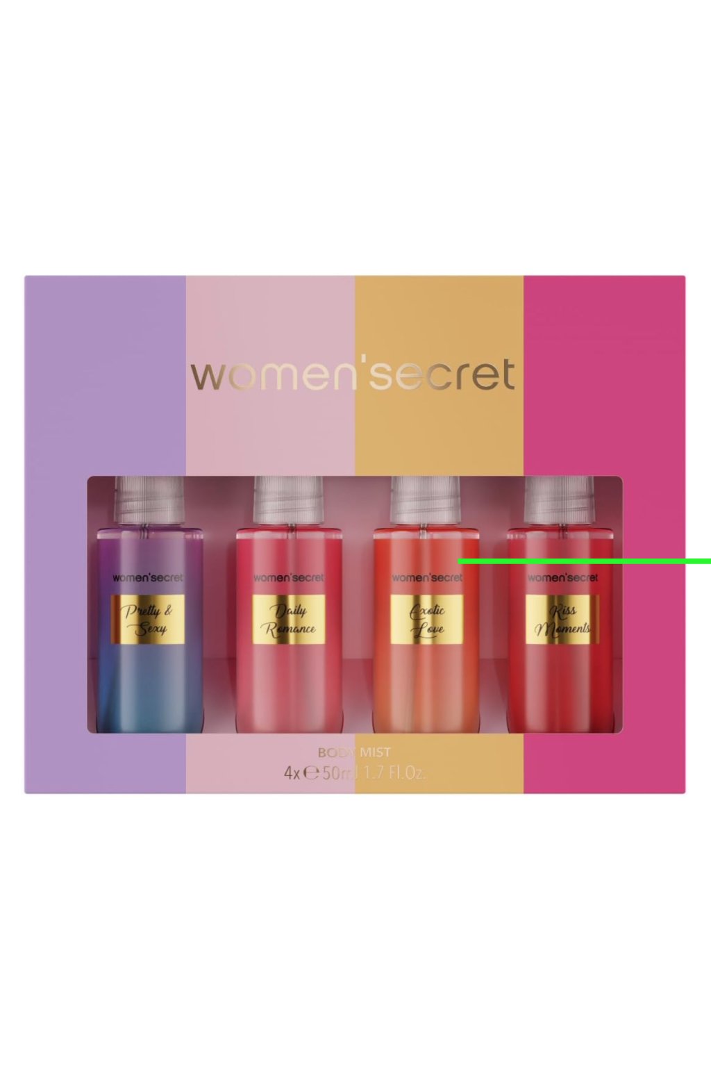 WOMEN’SECRET Body Mist Color Set je osviežujúci set štyroch rôznych vôní, ktoré vám poskytujú pocit sviežosti a relaxácie počas celého dňa. Tento set obsahuje 4x50 ml telového spreja v krásnych pastelových farbách, ktoré sa perfektne hodia na každodenné použitie. Vône sú jemné, no zároveň nezabudnuteľné, a sú ideálne na osvieženie pokožky po celý deň. Každý sprej ponúka inú vôňu, ktorá vás obklopí kvetinovými alebo ovocnými akordami. Skvelý darček pre každú ženu, ktorá si potrpí na zmyselnosť a osvieženie s nádychom luxusu. Set je prispôsobený aj na cestovanie v praktickom balení.