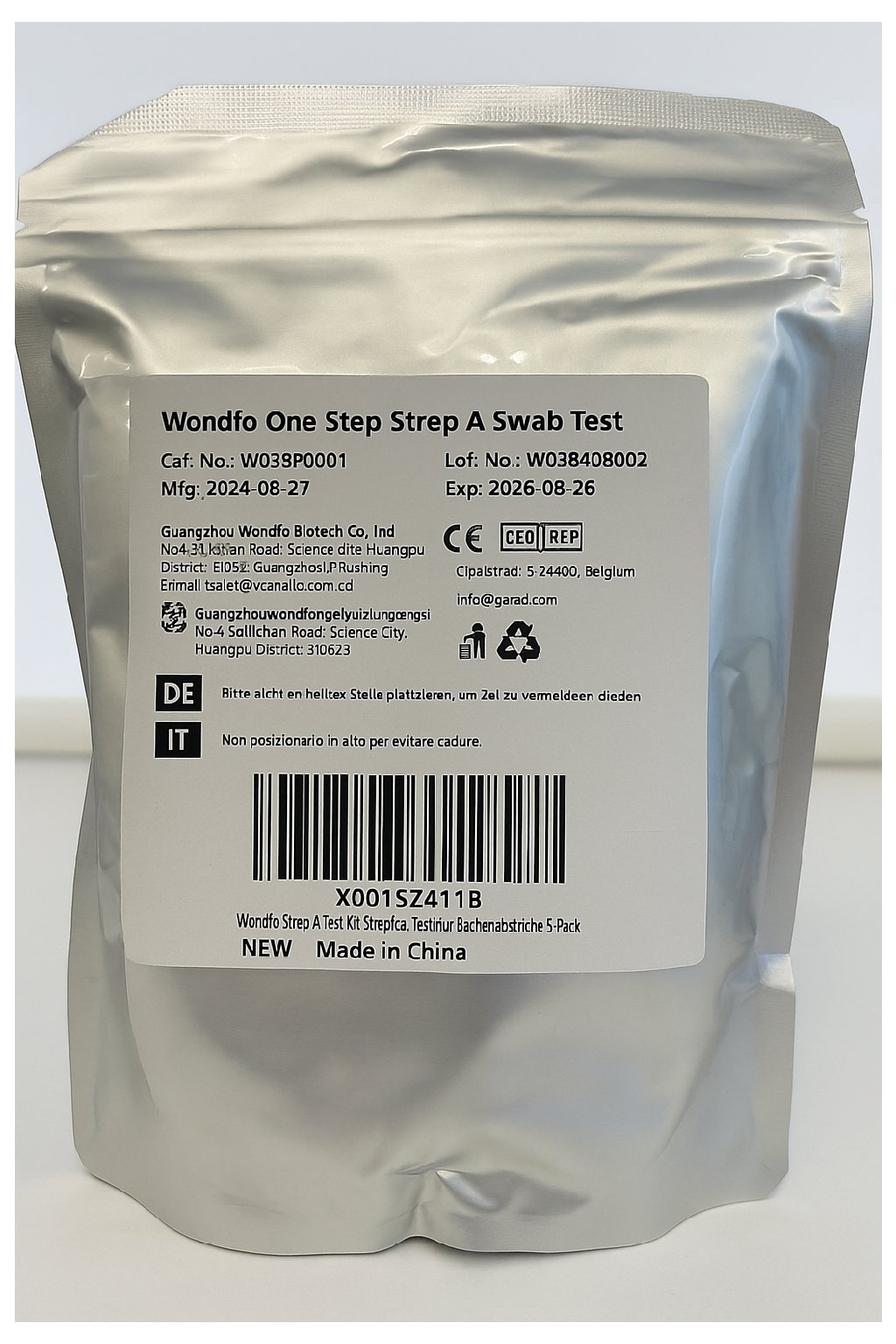 Rýchly diagnostický test Wondfo One Step Strep A Swab Test určený na detekciu prítomnosti streptokoka skupiny A (Streptococcus pyogenes) z výteru z hrdla. Poskytuje presné výsledky v priebehu niekoľkých minút.